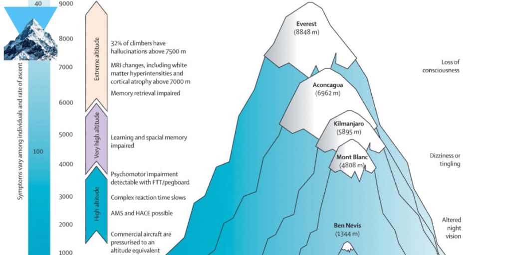 As elevation increases, the entire atmosphere’s pressure decreases, meaning there’s simply less air to breathe. Each breath delivers fewer oxygen molecules to your bloodstream, even though the proportion of oxygen in that air remains constant. At Everest’s summit in the death zone of Mount Everest, there is approximately 33% of the oxygen available at sea level. Imagine trying to climb stairs while only getting one out of every three breaths.
