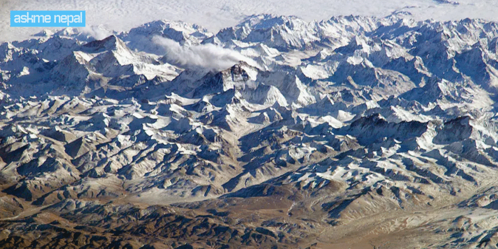 From orbit, Everest’s distinctive pyramid shape becomes immediately apparent. The summit rises sharply from three main ridges that converge at the peak.
