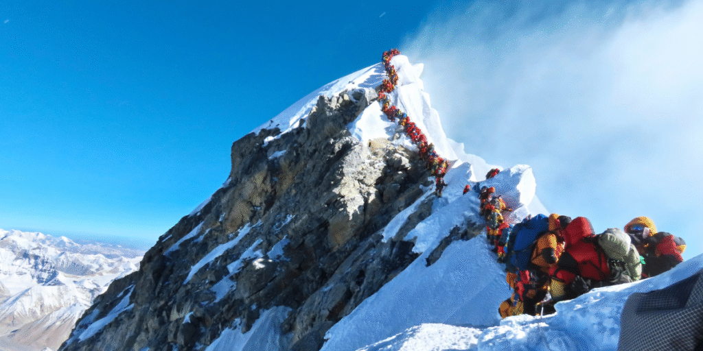 During peak season, summit congestion can dramatically impact the experience. The viral photographs from 2019 showed queues of climbers stretching down from the summit, with some waiting hours for their turn at the highest point. In 2025, May 18 and 19 saw 722 climbers reach the summit from the Nepal side alone, creating the infamous “Everest traffic jam” where hundreds packed the route between Camp 4 and the summit. Even in these crowded conditions, the surrounding panorama remains breathtaking, though the experience feels less like standing atop a wilderness peak and more like queuing at a high-altitude theme park.